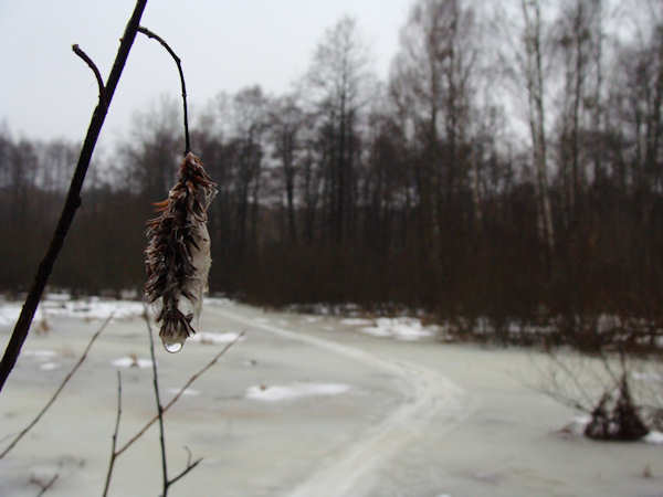 Komentarz: Generalnie sytuacja zmienia się bardzo szybko. W głębi lasu jest jeszcze względnie sporo śniegu, który jednak szybko zmienia się w breję, a na bardziej uczęszczanych szlakach – w lód. Lokalnie na szlakach widać już grunt. Nieciekawa pogoda sprawiła, że na szlakach pustki – jest to więc doskonała okazja, by wypatrzyć jakiegoś zwierza!