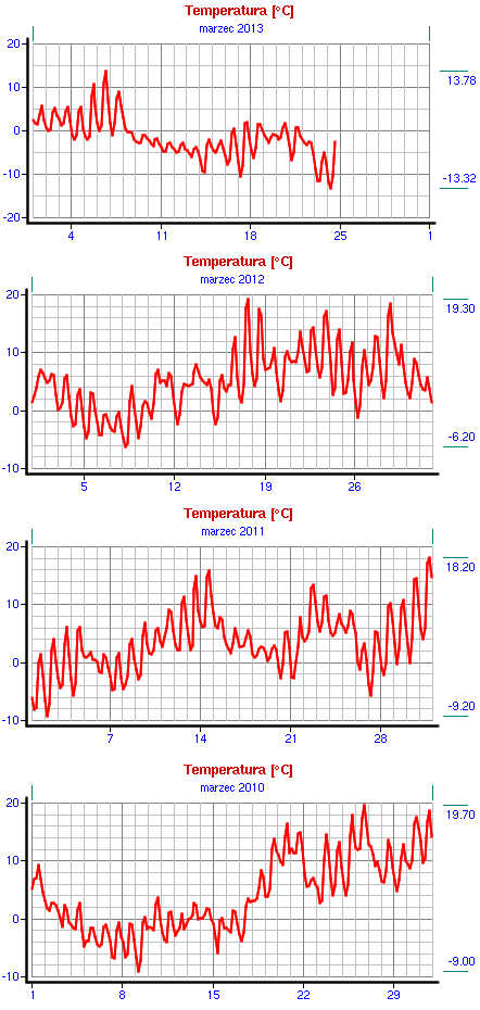 Ciekawie wygląda porównanie marcowych temperatur powietrza w Warszawie w ciągu ostatnich kilku lat. Wykresy jasno pokazują, że tak zimnego marca nie było od lat, a jeśli nawet były mrozy, to na początku miesiąca, a nie pod koniec. Gwoli ścisłości należy jednak dodać, że wg danych IMGW reszta tegorocznej zimy jest mniej więcej w normie, poza grudniem, który był nieco cieplejszy niż zwykle.