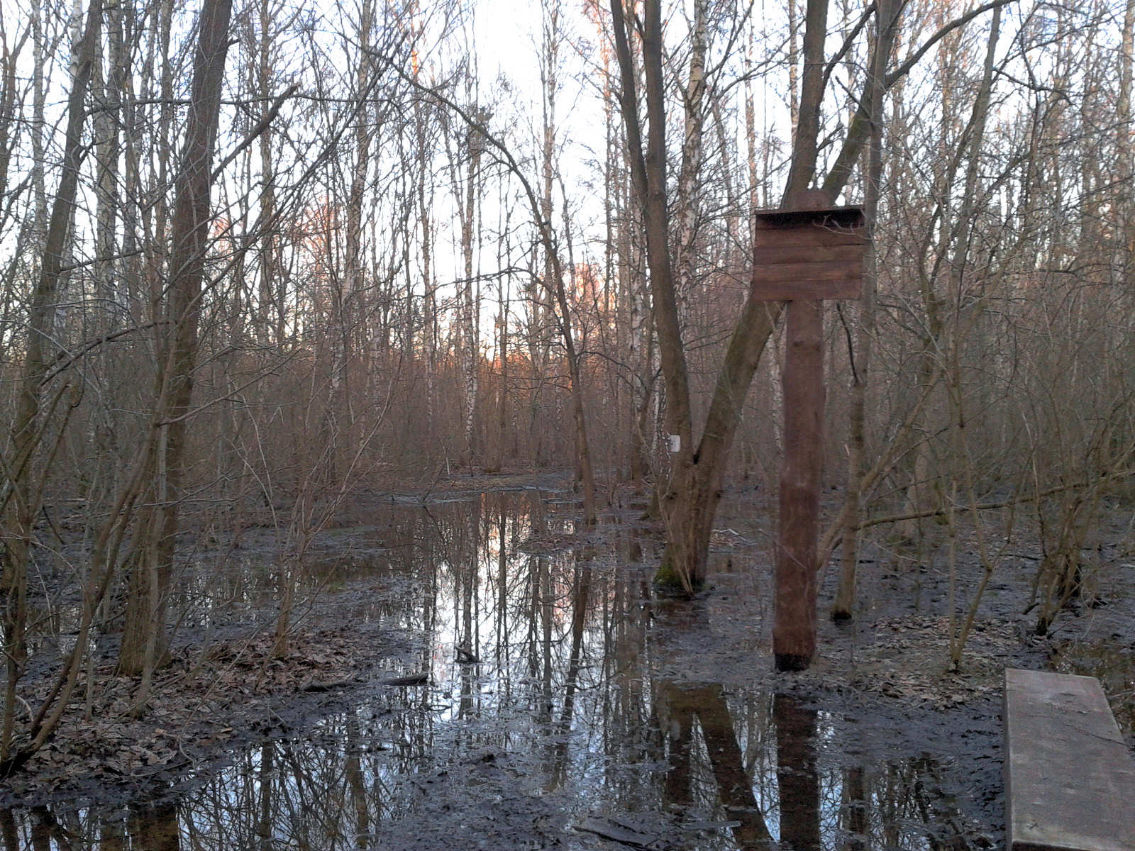 W tym roku spadło na tyle dużo śniegu, że po odwilży nie mogło zabraknąć na kampinoskich szlakach odrobiny błota. Jeśli chodzi o szlaki prowadzące przez wydmy, to jest względnie sucho, choć lokalnie można natrafić na kałuże. Oczywiście na szlakach prowadzących przez bagna jest znacznie bardziej mokro. Tam lepiej zapuszczać się tylko w dobrych butach. A na zdjęciu poniżej widoczny jest fragment ścieżki edukacyjnej „Śladami Łosia” w Lesie Bemowskim. Jak widać, można się na niej na własnej skórze przekonać, co to znaczy być łosiem. :)))