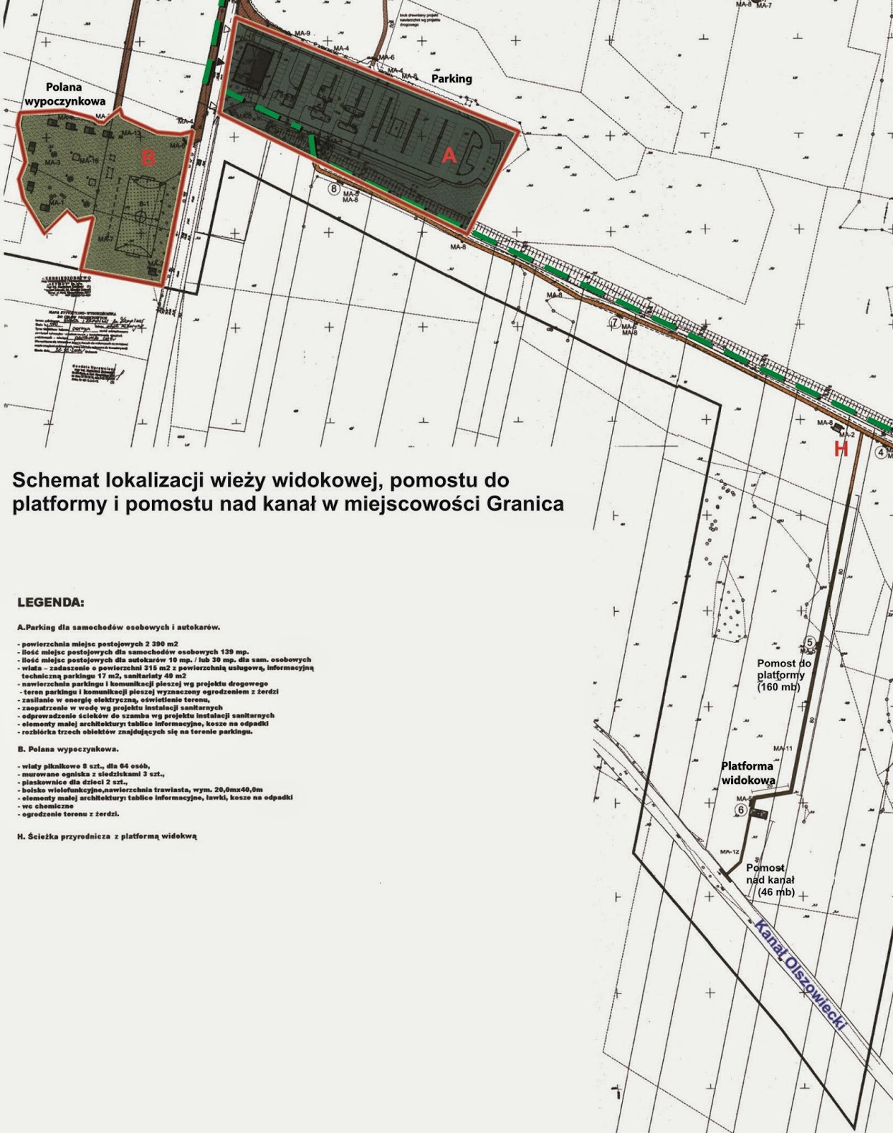 Wieża będzie się znajdować kilkaset metrów na południowy-wschód od parkingu w Granicy. Ma się składać z trzech poziomów. Podstawowy będzie na wysokości 1,88 m nad gruntem (podłoga). Z niego będzie można zejść na 0,55 m lub wejść na 3,07 m (szkoda, że tak nisko, ale i tak widok powinien być ładny).