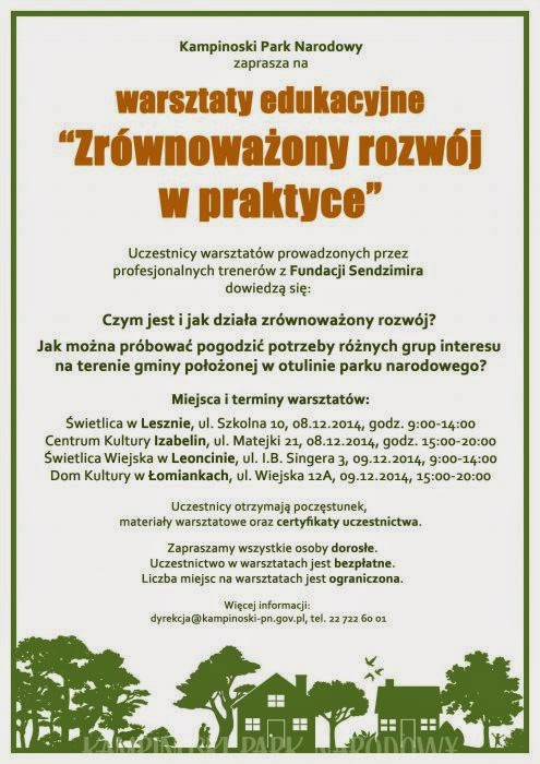 Kampinoski Park Narodowy zaprasza na bezpłatne warsztaty poświęcone zrównoważonemu rozwojowi w otulinie Puszczy. Uczestnicy będą szukali możliwości pogodzenia potrzeb różnych grup interesu na tak specyficznym obszarze, jakim jest dynamicznie rozwijająca się gmina w otulinie parku narodowego i rezerwacie biosfery. Dla uczestników przygotowany zostanie poczęstunek, materiały warsztatowe oraz certyfikaty uczestnictwa. Liczba miejsc na warsztatach jest ograniczona.