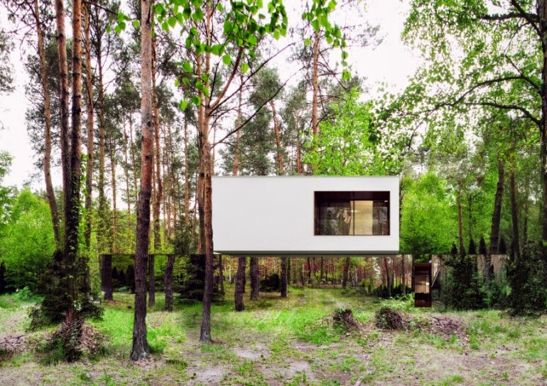 Z pewnością wielu z Was odczuwa spory dyskomfort, gdy w trakcie kampinoskich wycieczek napotykacie na architektoniczne ohydztwa w środku lasu. Jedna z pracowni architektonicznych zaprezentowała rozwiązanie, które choćby częściowo powinno zaradzić temu problemowi: dom z lustrami. Mają one być rozmieszczone na fasadzie tak, aby odbijały widok lasu i sprawiały wrażenie, że górna część konstrukcji (już pozbawiona luster) unosi się w powietrzu.