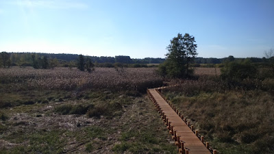 Zgodnie z moimi wcześniejszymi domysłami wieża, niestety, jest stosunkowo niska. Z pewnością sporo brakuje jej do podobnych obiektów wznoszonych chociażby w Biebrzańskim Parku Narodowym. Nie ma jednak co narzekać. Widok na kampinoskie szuwary jest całkiem ładny, a w dali dostrzec można nawet krawędź pradoliny oraz zabudowania wsi Kampinos. Nie mam jednak  wątpliwości, że szczególnie warto będzie wspiąć się na tę wieżę wczesną wiosną, gdy poziom wody w bagnach jest zazwyczaj wysoki, a trawa skoszona. Tymczasem na razie mamy niestety w tym względzie mizerię… od wieży odchodzi kładka do Kanału Olszowieckiego, ale na razie to kanał tylko z nazwy, bo jest raczej zarośniętym i wyschniętym rowem.