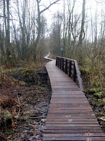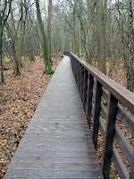 Faktycznie, już na pierwszy rzut oka widać, że obiekt wyróżnia się długością. Moją uwagę przykuło to, że – o ile się orientuję – kładka nie jest zbudowana z drewna, ale materiału drewnopodobnego. Jest to zapewne podyktowane tym, że inne drewniane kładki w Puszczy szybko się niszczyły, a w czasie deszczu były bardzo śliskie. Dowodem jest kładka na czarnym szlaku z Truskawia do Palmir. Na szczęście niedawno doczekała się ona remontu i już jest tam bez dziur (patrz fot. poniżej)