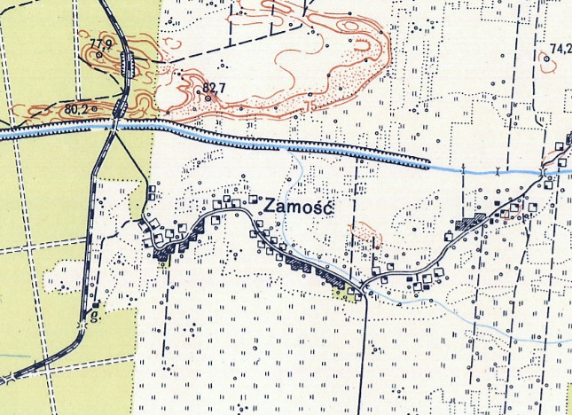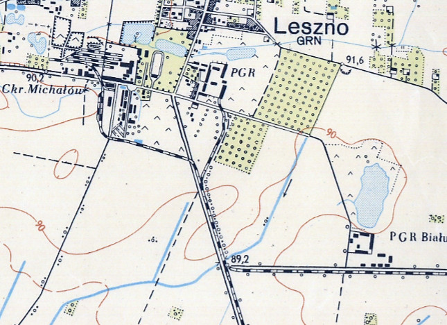 Jeszcze inną ciekawostką na tej mapie, o której tutaj nigdy nie pisałem, jest przebieg kolejki wąskotorowej do Leszna, która swego czasu obsługiwała tamtejszą cukrownię. Do dziś przy drodze Leszno – Błonie można znaleźć pozostałości po nasypie tej trasy.