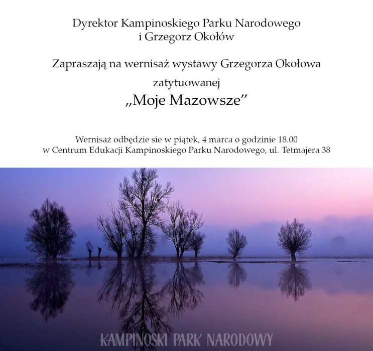 1. 4 marca (najbliższy piątek) o godzinie 18:00 w siedzibie Kampinoskiego Parku Narodowego odbędzie się wernisaż wystawy pt. „Moje Mazowsze”. Zobaczymy na niej piękne zdjęcia znanego fotografa Puszczy Kampinoskiej i Mazowsza Grzegorza Okołowa. Przypomnę, że ciekawy wywiad z nim można przeczytać w kwartalniku „Puszcza Kampinoska”.