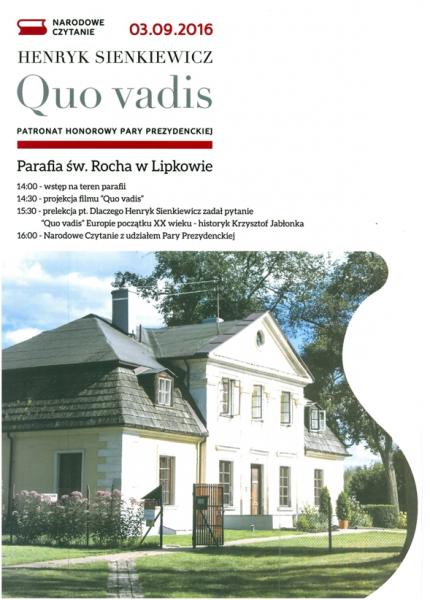 3 września w parafii pw. Św. Rocha w Lipkowie na terenie parku parafialnego odbędzie się Narodowe Czytanie ,,Quo vadis” Henryka Sienkiewicza, w którym weźmie udział Para Prezydencka. Wydarzenie rozpocznie się o godz. 14:30 plenerową projekcją 6. odcinka telewizyjnej wersji „Quo vadis” w reżyserii Jerzego Kawalerowicza oraz prelekcją, którą wygłosi historyk Krzysztof Jabłonka. W Lipkowie czytana będzie XII część przygotowanej przez Tomasza Burka adaptacji ,,Quo vadis” pt. ,,Koniec igrzysk”.
