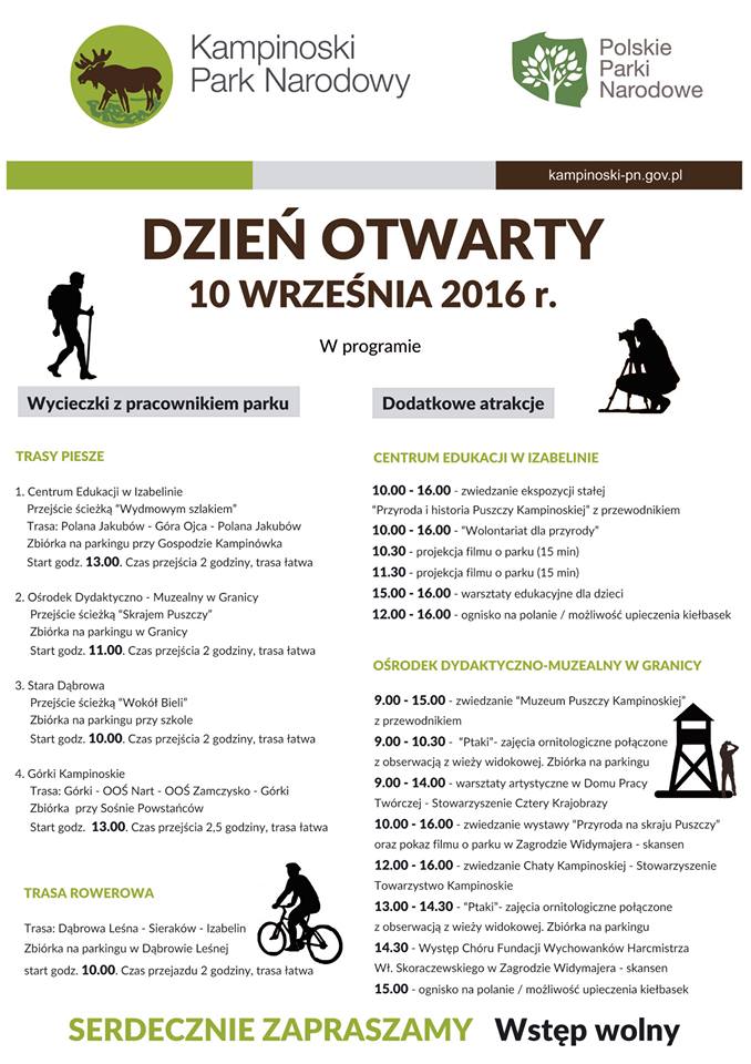 10 września w Izabelinie, Granicy oraz kilku innych miejscach odbędzie się kolejny dzień otwarty Kampinoskiego Parku Narodowego. W bogatym programie przewidziano m.in. wycieczki z pracownikami parku, zwiedzanie ekspozycji, projekcje filmów, zajęcia ornitologiczne, warsztaty artystyczne czy zwiedzanie Chaty Kampinoskiej. Wstęp na wszystkie wydarzenia jest wolny.