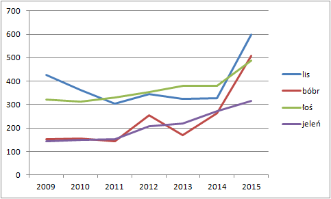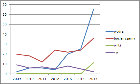 We wszystkich tych wykresach smuci tylko spadająca od lat liczba rysi. Jak widać, ich reintrodukcja nie zakończyła się sukcesem, bo jeśli podana w roczniku liczba dwóch sztuk na cały KPN jest prawdziwa, to trudno mieć nadzieję, że gatunek ten sam się w Puszczy utrzyma.
