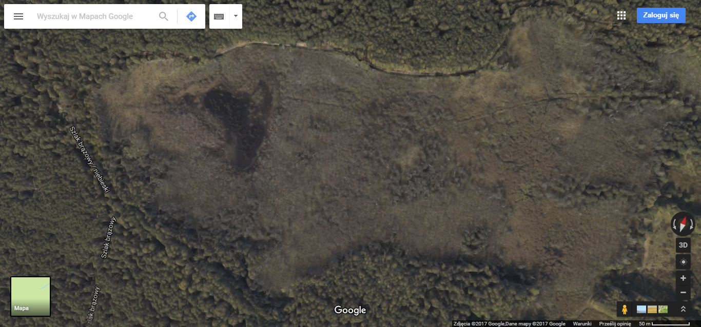 Pewien czytelnik zwrócił mi ostatnio uwagę na ciekawe zagadnienie. Otóż w okolicy atomowej kwatery dowodzenia (już świętej pamięci) znajduje się podmokły obszar, gdzie dotychczas było coś w rodzaju jeziorka. Widać je nawet na Google Maps (fot. poniżej). Zdjęcie to jest jednak sprzed kilku lat, bo już od jakiegoś czasu po „jeziorku” nie ma już śladu, a miejsce to zarasta.