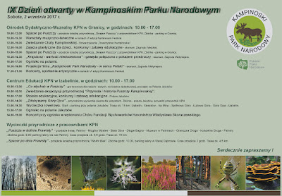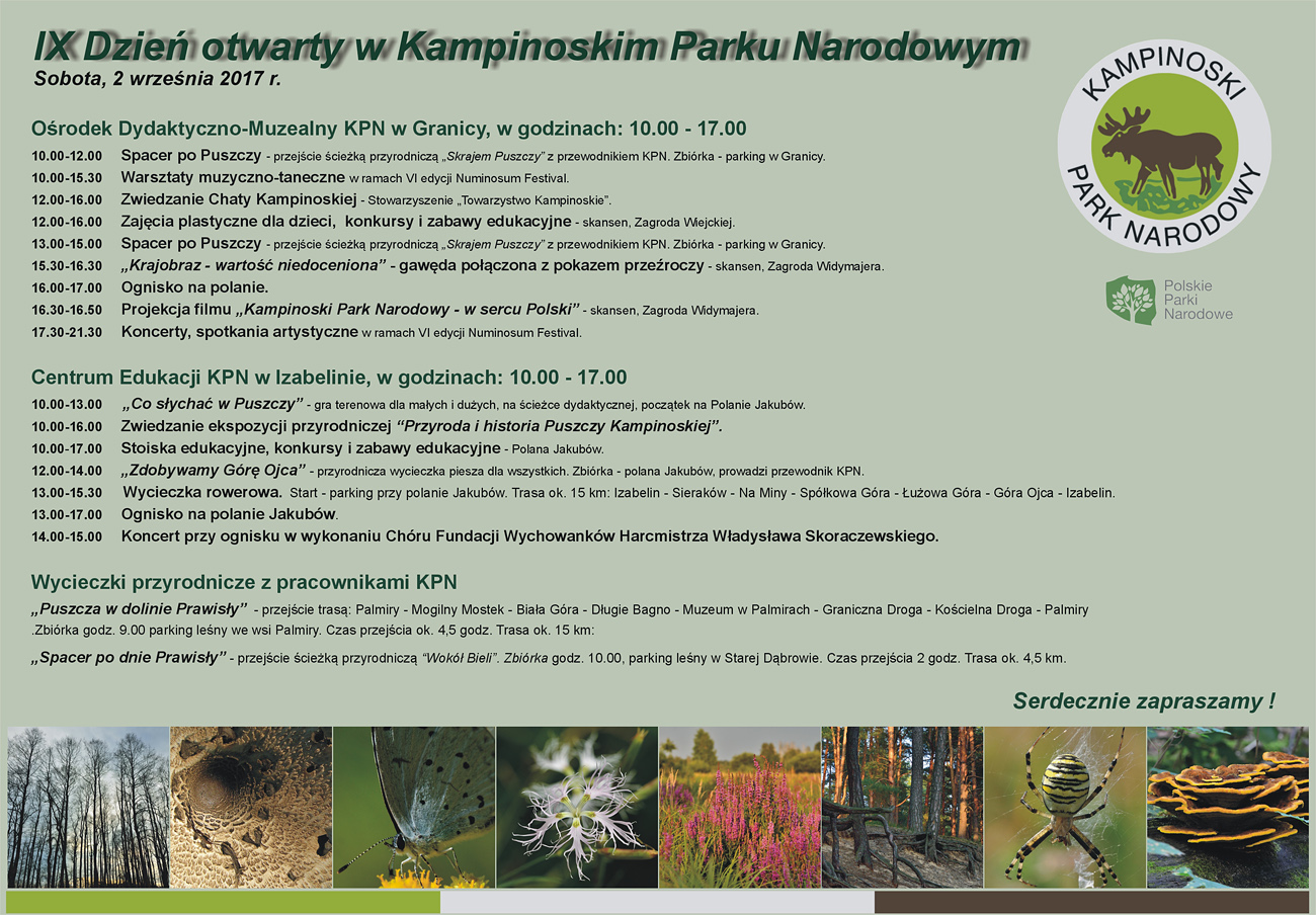 2 września odbędzie się kolejna edycja dni otwartych Kampinoskiego Parku Narodowego. W ramach imprezy przewidziano wiele wydarzeń w różnych częściach Puszczy, m.in. wycieczki edukacyjne z pracownikiem parku, zwiedzanie kampinoskich chat w skansenie w Granicy, warsztaty muzyczne, zajęcia plastyczne czy ognisko.