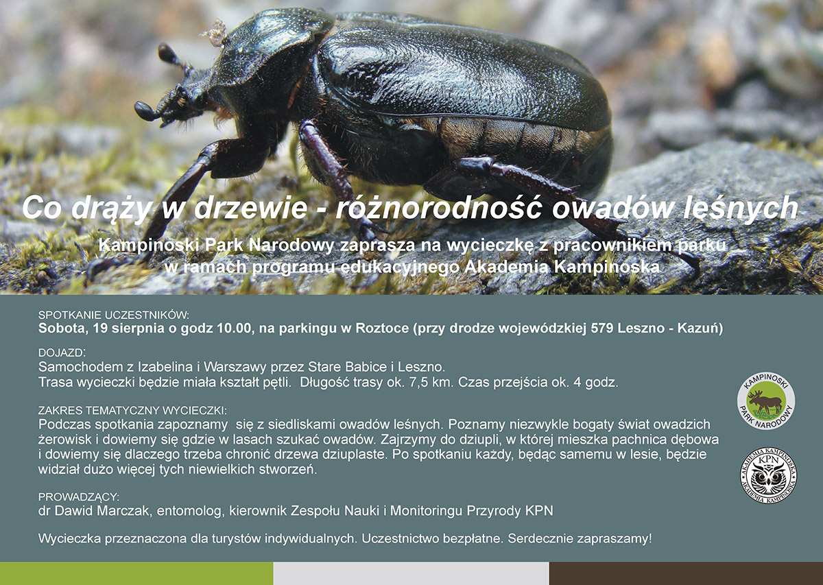 Podczas spotkania zapoznamy się z siedliskami owadów leśnych. Poznamy niezwykle bogaty świat owadzich żerowisk i dowiemy się, gdzie w lasach szukać owadów. Zajrzymy do dziupli, w której mieszka pachnica dębowa i dowiemy się, dlaczego trzeba chronić drzewa dziuplaste. Po spotkaniu każdy, będąc samemu w lesie, będzie widział dużo więcej tych niewielkich stworzeń.