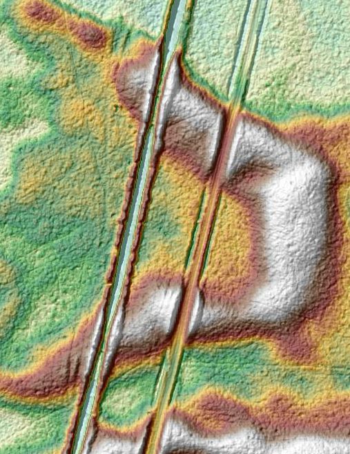 Wizualizacja rowu na danych z lotniczego skaningu laserowego. W przybliżeniu dobrze widać wyrównany poziom rowu lokalnie nieco zakłócony najprawdopodobniej przez osypywanie piasku (źródło: Kampinoskie Bagna)