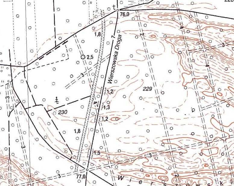Rów na mapie topograficznej (tuż na zachód od Wierszowskiej Drogi)