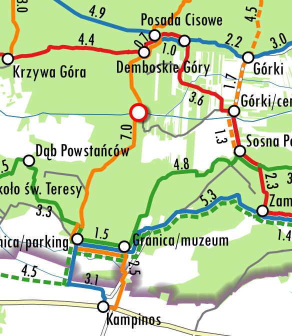 Gorzej sytuacja wygląda na żółtym szlaku łączącym Granicę z Posadą Cisowe. Tu wciąż nie ma kładki na Łasicy, co uniemożliwia przekroczenie kanału. Możliwe jest za to obejście brakującej przeprawy: na południowym brzegu Łasicy skręcamy na wschód drogą w kierunku wsi Zamość, za nią przekraczamy Łasicę, a następnie wchodzimy na czerwony szlak, którym dochodzimy z powrotem do żółtego w Posadzie Cisowe.