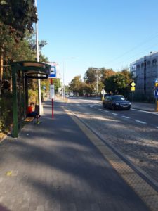 Hitem jest urwanie się ścieżki i chodnika na przystanku autobusowym – niewątpliwy powód do dumy dla jednej z najbogatszych gmin w Polsce. Odrobiną ulgi jest dalszy odcinek przez las, gdzie nie mijamy żadnych skrzyżowań.