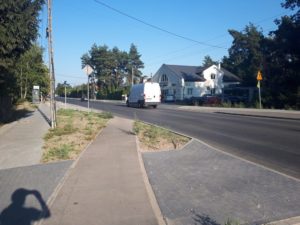 Ścieżka wraca za rondem przy kościele. Znów jest to jednak ciąg pieszo-rowerowy, lokalnie wąski i naszpikowany licznymi podjazdami do posesji. Dziwi, że przejazdy rowerowe przez skrzyżowania raz są, a innym razem nie ma. Jest też i nagłe urwanie się ścieżki na przystanku autobusowym. Co ma w takiej sytuacji zrobić rowerzysta?