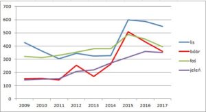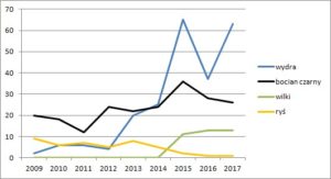 Jeszcze większy spadek widać w przypadku populacji bobra – ich liczba zmniejszyła się w ciągu roku o 17% do poziomu 358 osobników (w rekordowym roku 2015 było ich niemal pół tysiąca).