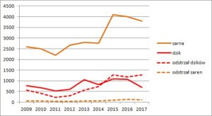 Dodajmy, że bardzo podatną na zmiany jest w naszych szerokościach geograficznych populacja dzika, co znajduje potwierdzenie w najnowszych statystykach. Na marginesie dodajmy, że za rok przygotujmy się na jeszcze większy spadek liczby dzików. Dane z 2017 r. obejmują bowiem tylko kilka tygodni akcji odstrzału dzików spowodowanej rozprzestrzenianiem się ASF.