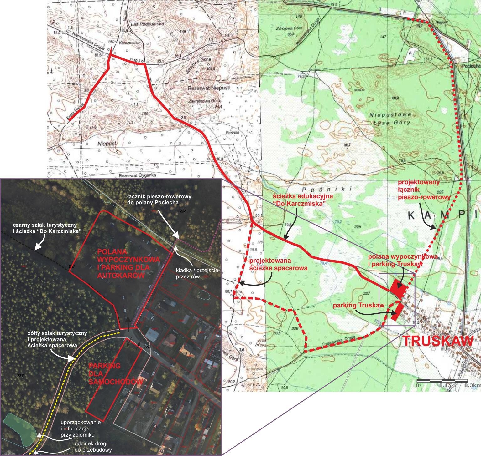 To najwyższa pora na uporządkowanie. To miejsce w weekendy permanentnie zastawione przez samochody. Powiększenie parkingu jest i tak konieczne. Pomysł z łącznikiem na północ jest bardzo dobry. Gruntówka z centrum Truskawia, nie jest atrakcyjna ani pieszo, ani rowerowo, ani na nartach. Wykorzystanie przecinki sieci eN to dobry pomysł. Ona jest okresowo wykaszana, więc „tam jest” i zawsze będzie to lepsze dojście niż gruntówka.