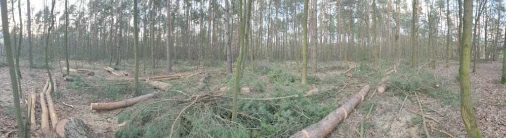 Wystarczy rzut oka na las w okolicach polany wypoczynkowej w Lipkowie, by przekonać się, że ta wycinka wydaje się znacznie większa od innych w Puszczy Kampinoskiej. Objęła dość spory obszar między parkiem i kościołem w Lipkowie a zabudowaniami Hornówka. Wszędzie leżą ścięte sosnowe gałęzie, a przy drogach ustawiono długie rzędy pni. Uwagę zwraca także to, że żywot zakończyło tu wiele drzew dojrzałych i zdrowych. Z drugiej strony trzeba podkreślić, że nie mówimy tu o wycince zupełnej – wciąż pozostała zwarta pokrywa leśna, choć oczywiście przerzedzona.