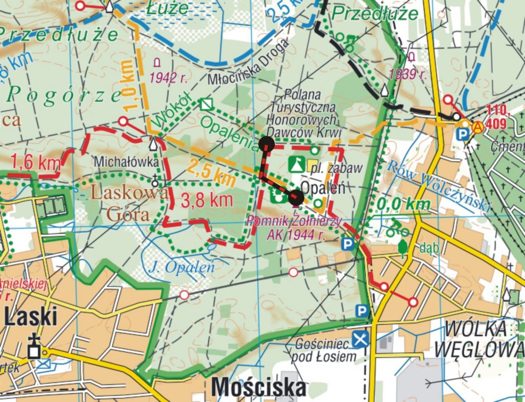 Już nie w związku z koronawirusem, ale z wycinką drzew zwaną pieszczotliwie „przebudową drzewostanu” zamknięto bardzo popularne szlaki żółty i czerwony w pobliżu polany Opaleń (patrz mapa poniżej). Zamknięte odcinki można obejść szlakiem czerwonym przez polanę Opaleń, a następnie ścieżką edukacyjną „Wokół Opalenia”.