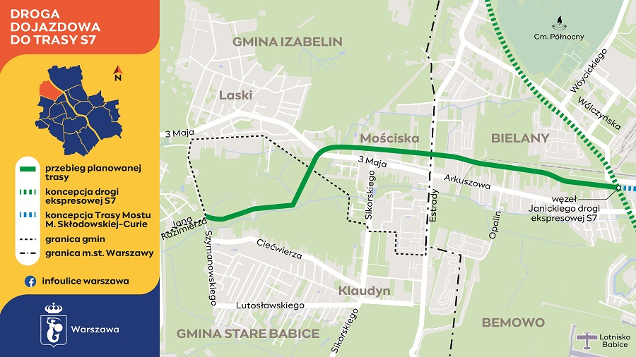 Swój bieg trasa ta ma zacząć tuż przy granicy Kampinoskiego Parku Narodowego, na styku Klaudyna (gm. Stare Babice) oraz Lasek i Izabelina (gm. Izabelin), gdzie krzyżują się obecnie dość kameralne uliczki Szymanowskiego oraz Jana Kazimierza. Stamtąd, przez pola, ruszy na wschód, ku stolicy, omijając Mościska i biegnąc równolegle do często zatkanego ciągu ulic 3 maja i Arkuszowej, by na koniec dotrzeć do projektowanego węzła „Janickiego”, który powstać ma na szykowanej nowej wylotówce na Gdańsk w ciągu drogi S7.