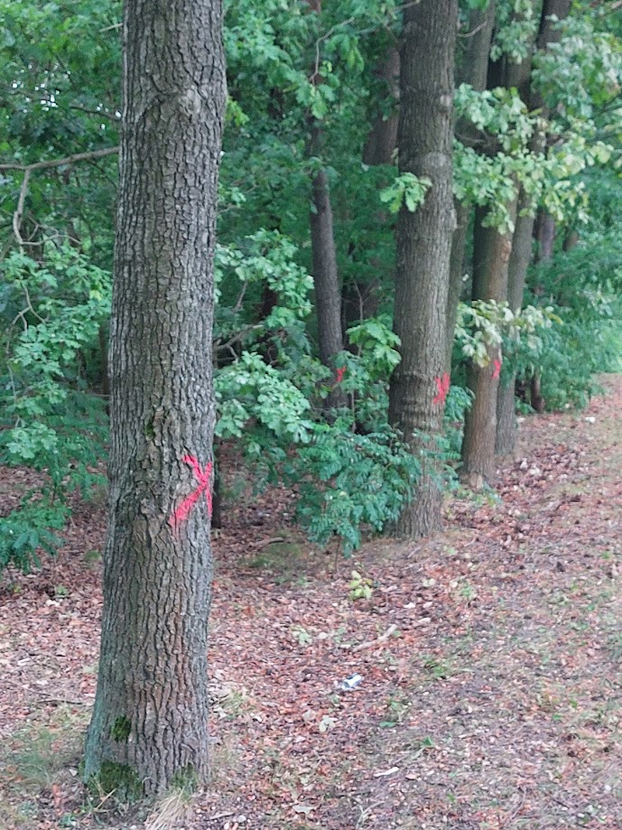 Ale strona wschodnia również nie jest bezpieczna. Ślady spreju pozostawione na wielu drzewach sąsiadujących z drogą wskazują, że wkrótce i one pójdą pod topór.