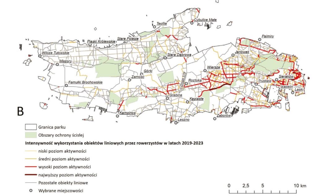 Do zbadania ruchu turystycznego w Puszczy wykorzystali oni dane GPS rejestrowane przez pieszych, biegaczy i rowerzystów w serwisie Strava. Oczywiście – jak uczciwie przyznają autorzy publikacji – takie źródło danych ma swoje wady. Główną jest oczywiście to, że pod lupę brany jest jedynie niewielki wycinek kampinoskich turystów, głównie sportowców. Pomijamy zatem choćby grzybiarzy, którzy w chwili pisania tych słów tak chętnie schodzą ze szlaków. Ale nawet mimo tych ograniczeń Strava pozwoliła przeprowadzić najdokładniejsze i najbardziej szczegółowe jak dotychczas badanie o ruchu turystycznym na terenie KPN.