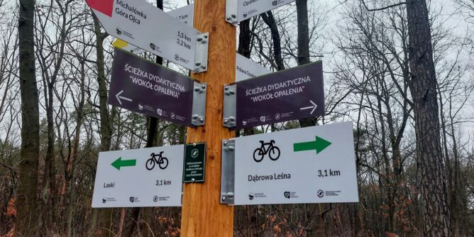 Nowością jest graficzne rozróżnienie drogowskazów dla szlaków pieszych i rowerowych oraz ścieżek edukacyjnych. Ponadto na każdym drogowskazie dodano oddzielną plakietkę informującą o nazwie miejsca, w którym się aktualnie znajdujemy. Ten ostatni element mógłby być nieco bardziej intuicyjny poprzez umiejscowienie go na samym szczycie słupka (jak to praktykuje się w niektórych innych parkach narodowych). Bo – przykładowo – umiejscowienie owej plakietki jak na tym zdjęciu może mniej ogarniętemu turyście sugerować, że do miejsca Za Opaleniem należy kierować się szlakiem żółtym pieszym i zielonym rowerowym. No, ale to oczywiście tylko takie rozdzielanie włosa na czworo. Generalnie jest fajnie i tylko wypada sobe życzyć, by nowa infrastruktura nie była magnesem na wandali.