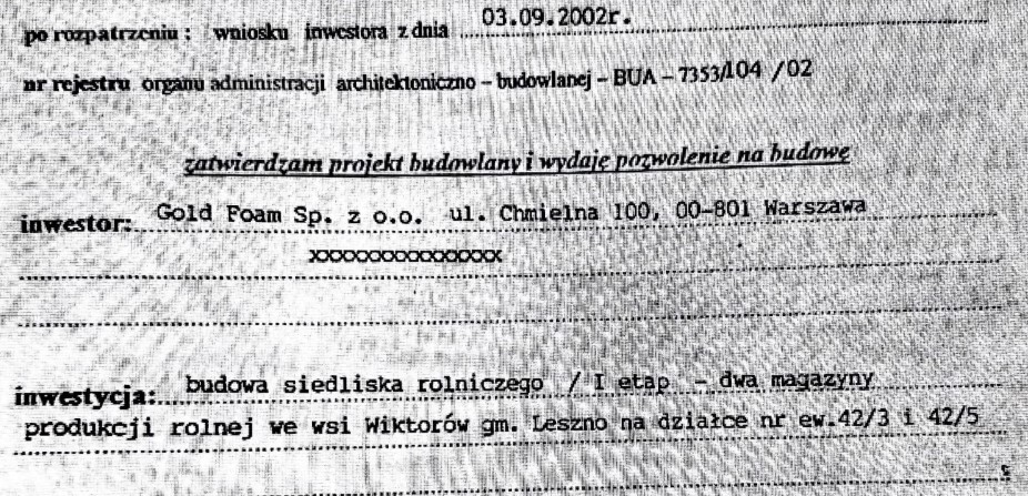 Z prośbą o nagłośnienie sprawy zwrócił się do mnie jeden z okolicznych mieszkańców, który – jak twierdzi – razem z około 60 właścicielami sąsiednich nieruchomości protestuje przeciwko temu, co się dzieje na gruntach Goldfoamu. Przedstawiając mi konkretne dokumenty, podkreśla, że zakład działa nielegalnie już od dawna. Świadczyć ma o tym chociażby pozwolenie na budowę z 2002 roku – Goldfoam deklaruje w nim, że na działkach 42/3 oraz 42/5 (obecnie zajętych przez fabrykę) ma powstać… siedlisko rolnicze, a konkretnie dwa magazyny produkcji rolnej!