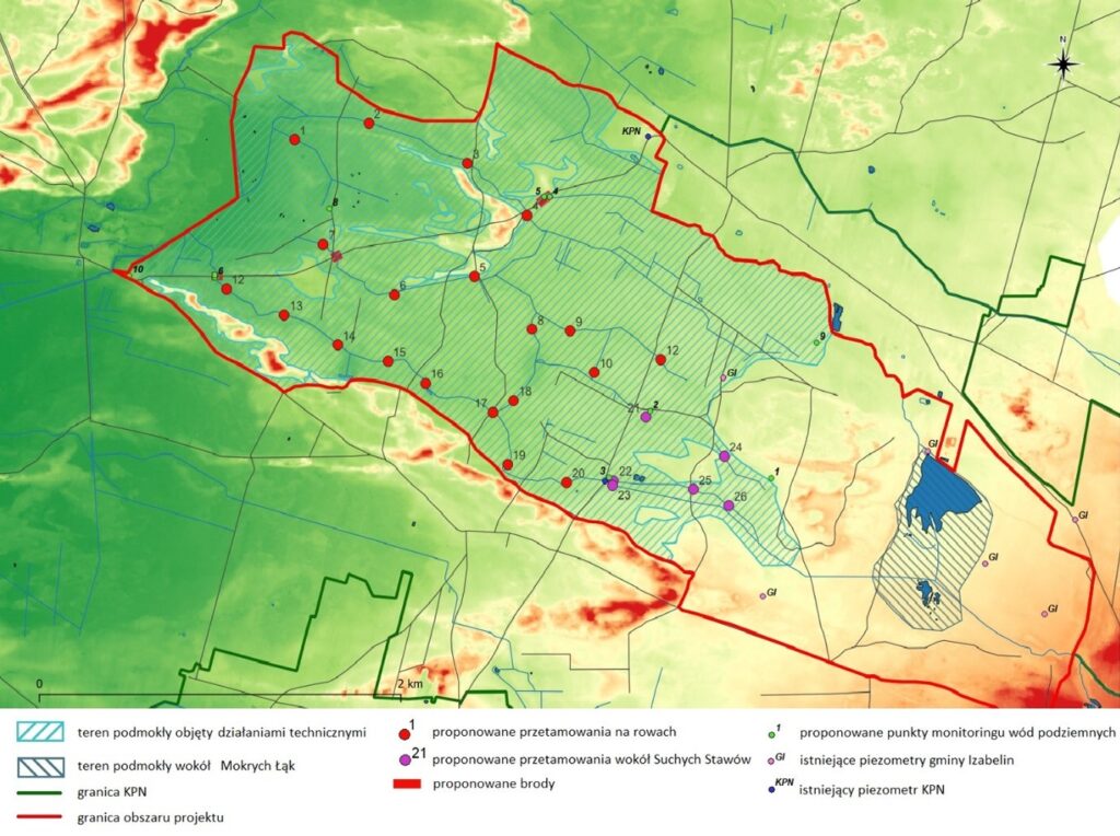 W ramach przedsięwzięcia KPN planuje wybudować około 20 przetamowań na rowach odwadniających teren wraz z pracami towarzyszącymi (np. przekopami), a także odtworzenie Suchych Stawów. Co ciekawe, w planach jest również budowa kładek umożliwiających przejście turystom (w tym niepełnosprawnym) podczas okresowych zalewów.