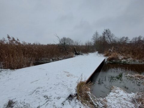 Dobre wieści z kampinoskich szlaków! Wprawdzie informacje w terenie oraz na stronie internetowej KPN wciąż mówią, że mostek nad Kanałem Zaborowskim w Debłach jest wciąż nieczynny, ale konstrukcja – jak widać na zdjęciu – jest już gotowa, a turyści z niej śmiało korzystają.
