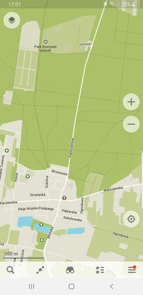 Po nazwie sugerującej (słusznie) czeskie pochodzenie trudno spodziewać się produktu przydatnego dla polskiego turysty. A jednak! W mojej ocenie to jedna z najlepszych mobilnych aplikacji mapowych do eksploracji kampinoskich szlaków. Wyróżnia ją przede wszystkim wizualizacja wszelkiej maści szlaków turystycznych (nie tylko pieszych) oraz atrakcji turystycznych w połączeniu z bardzo estetycznymi i czytelnymi mapami, z których można korzystać off-line. Jest tu też łatwa w obsłudze funkcja wyznaczania tras pieszych i rowerowych. Czego więc jeszcze do szczęścia potrzeba? Cóż, przydałyby się zdjęcia lotnicze/satelitarne (choć, bądźmy szczerzy, to przereklamowany gadżet) oraz trochę więcej narzędzi do pracy na mapach.