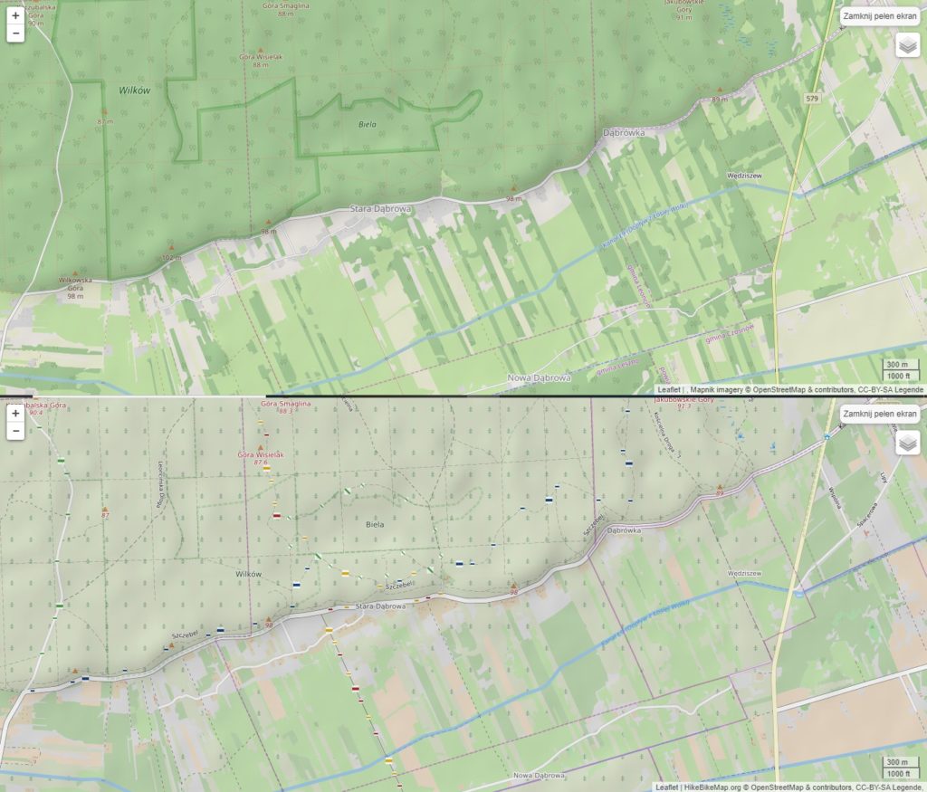 - Szlaki turystyczne – nie (wybrane są oznaczone tekstowo, co jest jednak widoczne dopiero przy dużym przybliżeniu)
